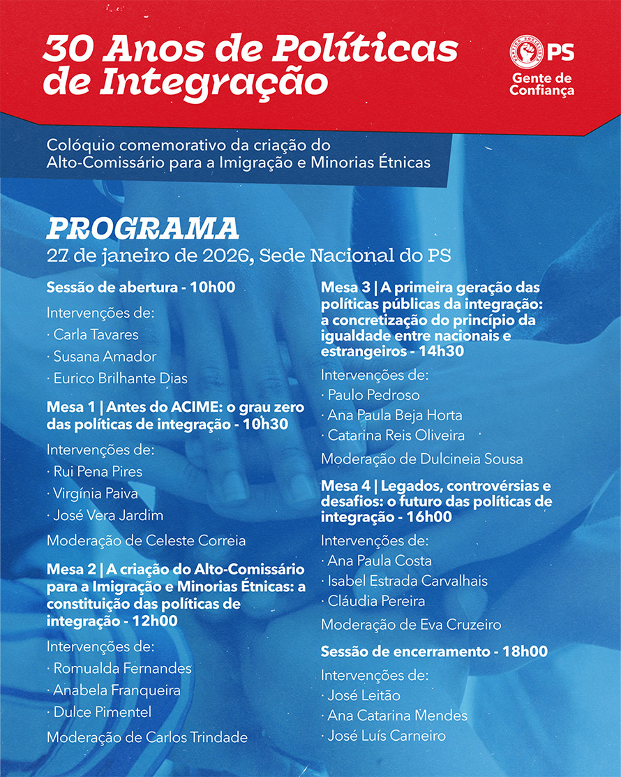 Sob o mote “30 Anos de Políticas de Integração”, este encontro visa afirmar o legado do PS nesta área e sublinhar que Portugal construiu, ao longo das últimas décadas, um modelo de integração amplamente reconhecido a nível internacional, como atestam relatórios comparativos, nomeadamente os do Migrant Integration Policy Index – MIPEX.