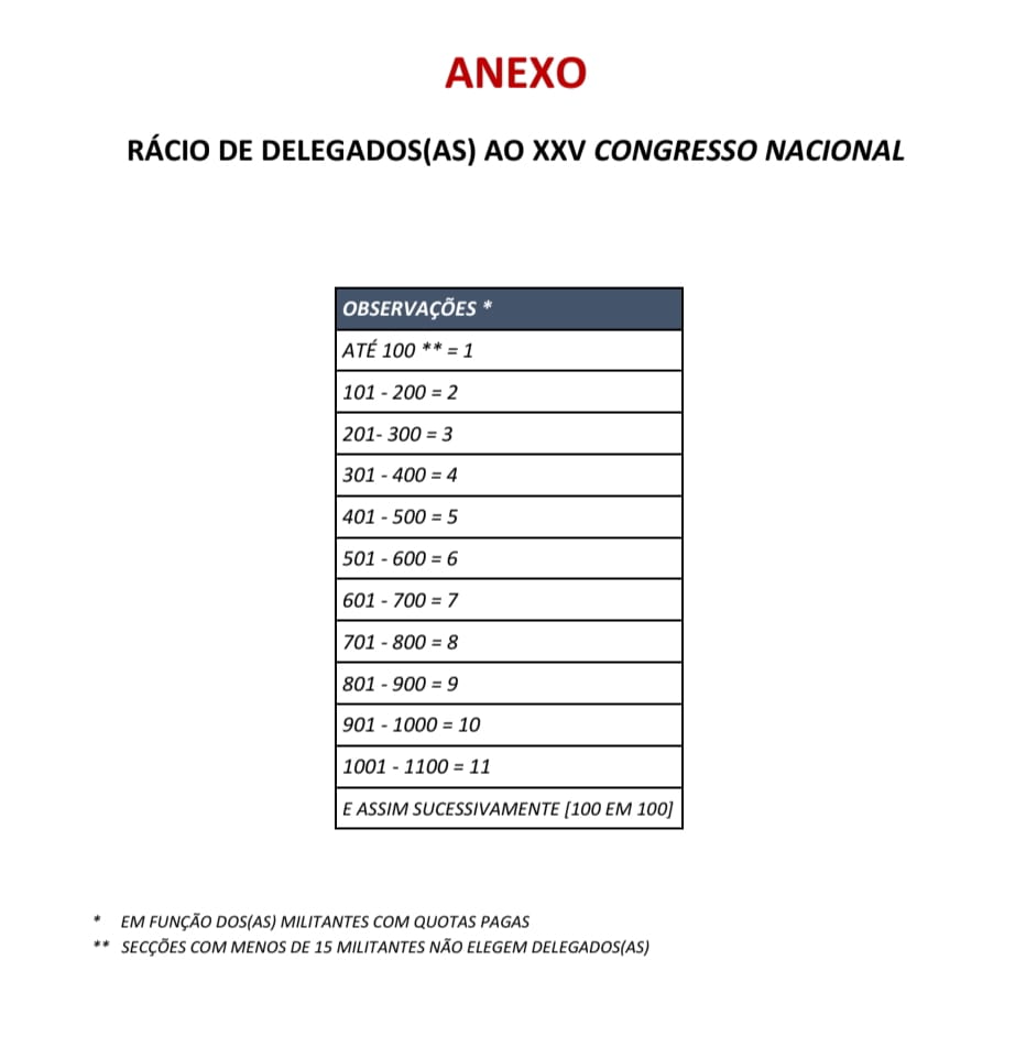 - Rácio de Delegados ao XXV Congresso Nacional